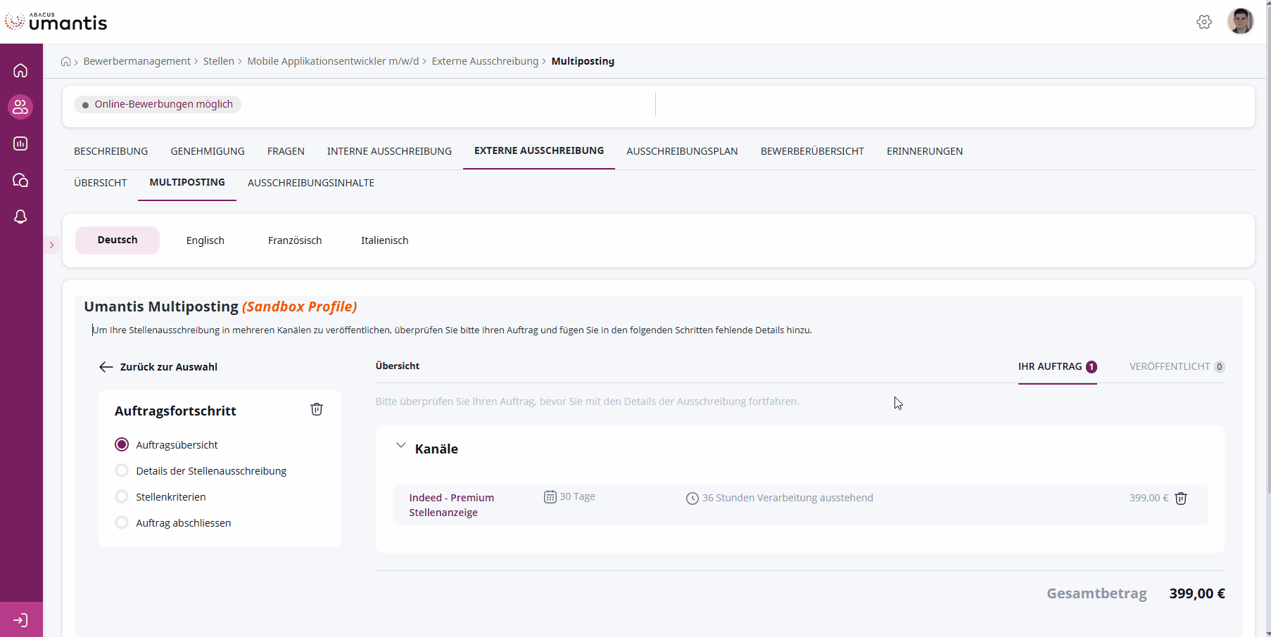 Die Multiposting-Funktion ist in Ihrer Umantis Bewerbermanagement-Lösung enthalten. Sie können diese auf einer Stelle über den Reiter „Externe Ausschreibungen“ unter „Multiposting“ aufrufen.